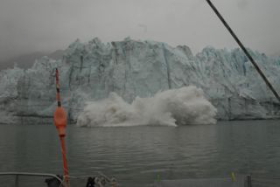 We motored for miles up the Tarr Inlet and firstly visited the Margerie Glacier. This is a stable glacier but spectacular, the noise of the cracking was like thunder and we heard it before we saw it. Gingerly we moved around the face of the glacier watching the odd piece of ice plummet into the sea causing huge splashes and then, one area carved in front of us, plunging into the water causing a mini tidal wave and icy wind to travel quickly towards Amelie. Peter caught the moment on camera and Stephen put the engine on and motored us out of danger. Exhilarating and frightening all at the same time. The water turned a milky mocha colour and chunks of ice became the “bergie bits” floating with the current. I’m afraid the huge John Hopkins Glacier that is advancing and thickening was a disappointment in comparison. We spent a huge amount of time dodging ice bergs and ice sculptures, many of which had sea-lions lounging on them. The day just got better by a sighting of a large Grizzly turning over stones for tasty morsels. He was unperturbed by us and when he had exhausted his endeavours, he cantered off into the forest. We anchored off Russell Island and celebrated a great day……..more alcohol. We battened down as it was cold and foggy and blasted the cabin with heat.