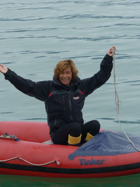 The next day was fog, fog and even more fog. Stephen had to retrieve the crab trap and unfortunately it had been dragged 150 metres up on the shore. He waded in and climbed the boulders to reclaim his trap as he had lost one already, no crabs only seaweed. He returned to Amelie, damp, cold and shivering but soon warmed up with one of his special Hot Chocolates with spray cream. When you get days like this you yearn for a sighting of anything and we were congratulated with a breaching whale not far from Amelie.