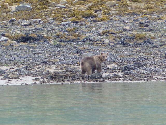 The noise of motoring becomes monotonous so if we can sail we will, this was seldom and this particular day was a long one. We headed for the Muir Inlet passing hundreds of red and white beaked Tufted Puffins in Sednee Cove. The noise of chainsaws from the South Marble Island turned out to be a noisy settlement of Stellar Sea-lions. The bulls were enormous and made the most noise, the sows and pups slept on the rocks in the sun, barely raising their heads when we glided past. The plan of the day was to visit the Riggs and Muir Glaciers which are both slowly receding, between 0.5 and 2 feet a day. Since they were our first glaciers close up it was pretty exciting but the best would come several days later. The wind was icy cold and we entered Wachusett Inlet without difficulties..Within a short period of time, Peter (Hawk Eye) sighted a largeGrizzly Bear foraging for sweet shoots and crustaceans on the shore. The anchor being lowered didn’t disturb him but allowed us to take some fantastic pictures of his/her large shaggy head. We watched the bear amble along the shore for about an hour before they disappeared from sight. This inlet is also famous for a photograph of a motor boat high and dry on rocks, showing the necessity of getting your anchoring right. We slept well that night.