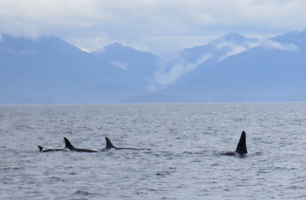 During late morning we sighted a large pod of Orcas fishing alongside us, with their distinctive erect dorsal fins (fins for adult females reaching 90cms and adult males 180cms). Cameras and binoculars were at the ready. Orcas are the largest members of the Dolphin family, the apex predator in marine systems and three ecotypes of Orcas can be identified; Residents, Transient (Bigg’s) or Offshore. The Residents primarily feed off salmon; Transients off marine mammals such as seals and porpoises and lastly the Offshores who are rarely seen in these waters, feed off bony fish and sharks. The Offshores teeth are generally worn down (reports suggest due to the tough skin of Sharks) unlike the other two who have sharp, spiky teeth with minimal wear. Apart from their different dietary preferences, these three ecotypes do not associate with one another or interbreed despite sharing the same oceans. Orcas are social and live in groups….pods. The Residents are matrilineal composing an older female with her sons and daughters and her daughters’ off spring. They sometimes travel in Super-pods with related matrilines and have vocal calls which are unique to the group. When foraging the pod spreads out sometimes over several square kilometres, swimming in the same direction, communicating by underwater calls. They find their prey by echolocation and do not appear to herd or capture prey cooperatively. They rely on individual effort with the occasional help from a close member of the matrilines. Transients travel in groups of 2-6 and their offspring often disperse for long periods and sometimes forever. They share a distinctive set of calls which is identified by other Transients. Their hunting technique is one of silence and stealth in groups circling small islets and reefs. They use cooperative hunting tactics to catch and kill their prey, either encircling and tiring them or tag hunting, whereby the whales take it in turns to chase prey until it is exhausted. They also use herding tactics for large numbers of prey chasing them into shallow and narrow bays, sometimes beaching their prey where they can have a feeding frenzy. Offshores tend to travel in huge pods, not all related. Little is known about the Offshore’s hunting but they also use vocal communication.
