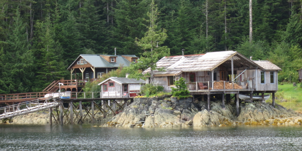 Next stop along the Clarence Strait is Meyers Chuck on Meyers Island, a small harbour with complete protection. Our first impression was a quiet, quaint looking fishing village with a mixture of cruisers and fishing vessels, moored on the public pontoon or like us, anchored in the tight bay. We could see why the pilot book said that it could be easily missed. Despite the deteriorating weather, we decided to stay an extra day to explore even if it meant donning foul weather gear. As we were going ashore for our stroll a seaplane, circled the cove and landed at the public dock, depositing and collecting passengers. It’s takeoff was alongside Amelie and we held our breath watching the ‘plane leave the bay. Meyer’s Chuck is a scene out of a fairy tale, wooden copses and trails through the trees, leading who knows where? Wood smoke puffing out of the chimneys of the inhabited buildings whilst the summer lodges look empty and lifeless. Old and new homes nestle beside one another, some looking like gingerbread houses but overall a cosy feel to the place. The old post office lies across the harbour on its own tiny island and we had the pleasure of meeting the postmistress twice, once hawking her Cinnamon rolls to us, waking us from our slumber and the second time in the wonderful gallery with works of local artisans and artists. The smell of Cedar in the gallery was warm and inviting with an old wood stove on one wall. Walking around this hamlet we came across the angling club which was also the small machine shop, with an industrial wood saw outside and various tools hanging on nails near at hand.