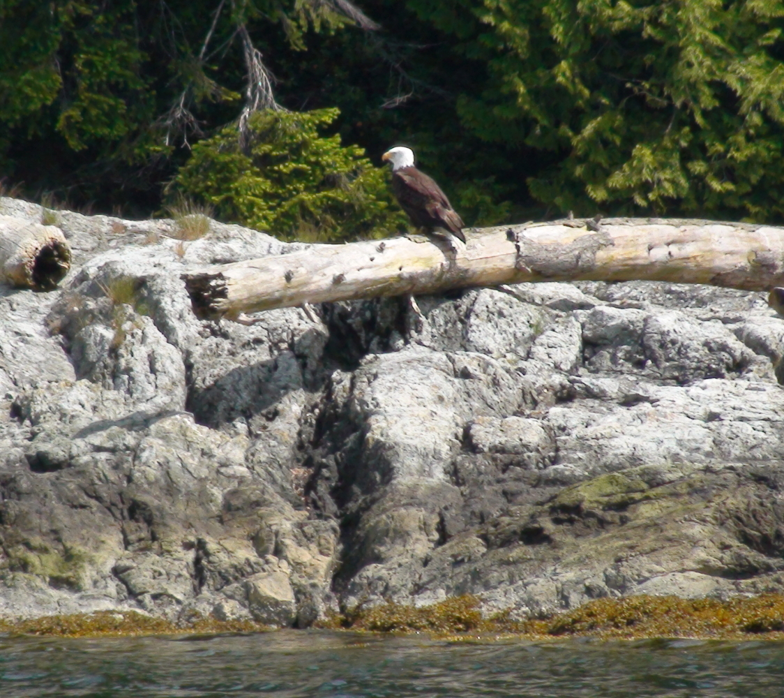 The Deer and Broken Islands in the Sound are a kayaker’s paradise which we took full advantage of, anchoring in a protected bay off Effingham Island. The cheeky Ravens continued to hassle, this time the Bald Eagles. We were disappointed by the lack of variety in wildlife here and after a mammoth kayak trip, viewing gnarled old trees on monolithic sea stacks, we retrieved our crab-trap, up-anchored and had a blowy trip across the Sound to Spring Cove, close to the village of Ucluelet (translated as “safe harbour landing” in Nuu-chah-nulth language). Spring Cove historically is where the fishing boats used to discharge their daily catch. Ruins of buildings on the shore and rotting wooden piles erupting out of the water, illustrated a past busy fishing port. Early pioneering families used their bare hands to clear trees to build their homesteads here. They started canneries but it wasn’t until after the first world war, that fishing boomed with the introduction of modern trolling methods by the Japanese. This unusual area has a thriving community. It has a large fishing fleet, the commercial hub of Barkley Sound, fish processing plants and excellent provisioning opportunities. We were welcomed by a toothless First Nations lady called Theresa, who loved our RIB and chatted away as if she had known us for years. As we left the dock, laden with our shopping, a group of youngsters frantically waved and wished us well. A busy village but with time to welcome strangers and pass the time of day.