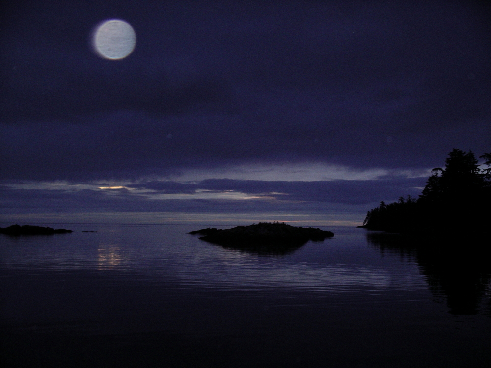 The skipper relies on the three day weather forecasts and is pretty skeptical of anything further ahead. Our time in Gwaii Haanas was coming to a close and we were looking for fair weather to cross the notorious Hecate Strait. Friday was forecast as favourable ahead of gales coming in for the weekend. The decision was made that Friday was our departure day and to get a good start across the Strait we decided to leave Kostan Inlet at high water that evening returning to Ramsay Passage Cove, which was not dependent on high tide for entry or exit.