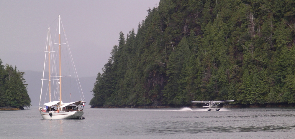 One of the things that we have observed during our time in the islands is that no matter what the weather or difficulty of access float ‘planes will constantly ferry their passengers to and from the few ecotourist boats that potter around the area. Thick fog, rain and low cloud that occluded our view of the entrance of Anna Inlet did not deter two float ‘planes from landing in the narrow inlet.