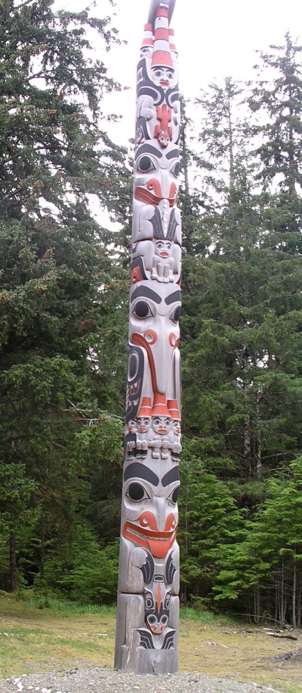 The Legacy Pole was erected in 2013 celebrating twenty years of co-management of Gwaii Haanas by the Haida nation and Canadian government. The pole was carved by two brothers who are master carvers and the sons of a chief who first had dealings with the federal government in the 1970s. The trunk came from Port Clements and the shape is that of a Frontal Pole, hollowed out to give lightness for transport, as was the practice in the past. This is the first to be commissioned and erected in 150 years, mainly due to the cost. In the past, a master carver would be paid in trade or supported for a period of time. Today such a pole costs approximately $100,000 and was paid for by Canada Parks. The history carved and painted on the pole spans the ancient world and modern day. At the base, there is a fish representing the ocean floor and at the apex, an eagle representing the mountain tops. Above the fish is a bear, honouring the extinct Haida Brown Bear that roamed these parts around 14,500 years ago. Skeleton evidence has been discovered with stone weapons still embedded in the bones, allowing carbon dating. Alongside were bones of domestic dogs which may have been used to hunt the bears.
