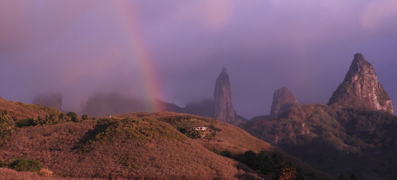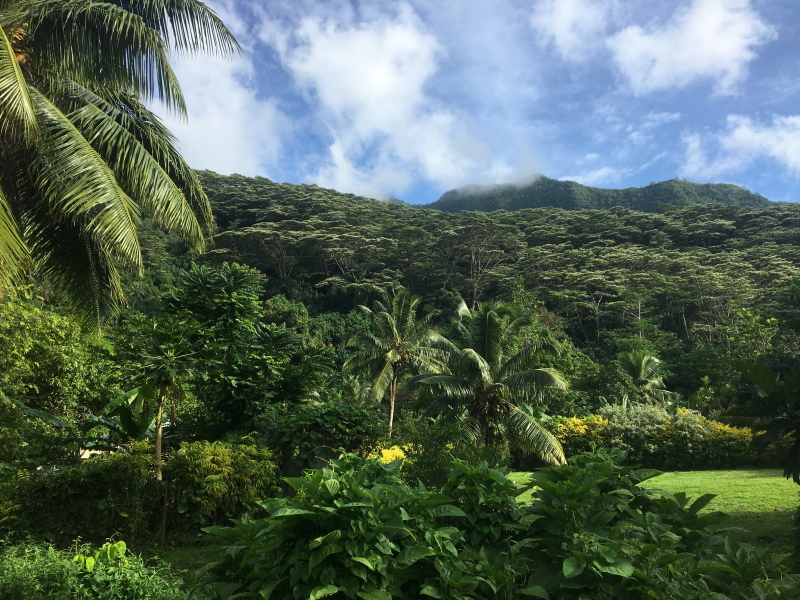 A beautiful, energetic hike up Magic Mountain with views across the farmlands on one side and clear views of the pass and the numerous reefs below us, took our breath away. We had moored “M” at a sturdy pontoon in Papetoai, a small village with several shops, the oldest church on the island, pharmacy, post office, government building and clinic. Once again the walk along the roadside to the entrance to Magic Mountain, was abundant with tropical fruits. Luckily Annie, who is a professional gardener, pointed out various trees that we wouldn’t have noticed.
