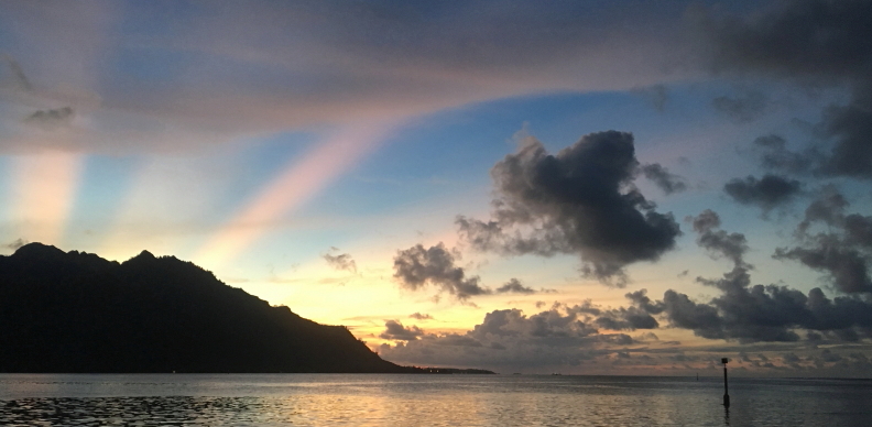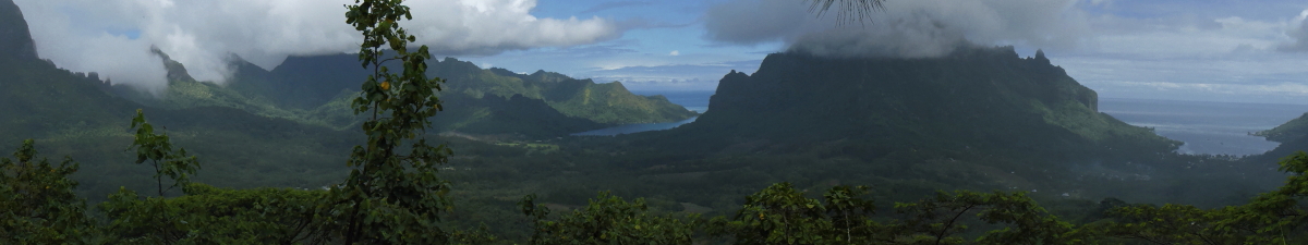 We anchored in Cook’s Bay via Avaroa Pass with the wind howling kicking up a slight fetch. The hook held fast in the renowned muddy seabedand we lowered “M” to check in with the Gendarmerie, who weren’t interested but extremely welcoming. We were visited by Silvio and Sunny from Barbarossa who suggested a hike to the Three Pines and down to Belvedere, circling back to the dinghy dock during our stay. Early morning, the four of us plus Mikael and Lena from Fortune Light enjoyed an energetic five hour, 11 km hike, with breathtaking views of the two bays from 300metres above sea level, hardly meeting any other walkers until we arrived at the Belvedere. This lookout is the highest point accessible by car….ATVs, bikes and lots of tourists. Close by, on the hiking trail, are several beautifully maintained Maraes. These maraes were even more impressive than the Marquesan ones, but after a while, once you’ve seen a few….. Throughout our hike we came across old foundations peeping out from the vegetation of ancient settlements. Ginger, Avocados, Passionfruit and Tahitian Limes were in abundance, growing wild along the trails. Birdsong followed us throughout the hike, although we struggled to view the choristers as the forest canopy hid the chirpers. We slipped through muddy paths, zig-zagged our way along the steep parts, circled around grand old trees in our way and then reached the coastal road that led us back to our dock. Tired, aching but extremely happy of our achievement, we retired to Amelie, plunging into the sea to cool down and then dried in the sun, reading our books. We’ve recently heard the sad news that Lena drowned in north Fakarava….RIP, Lena.