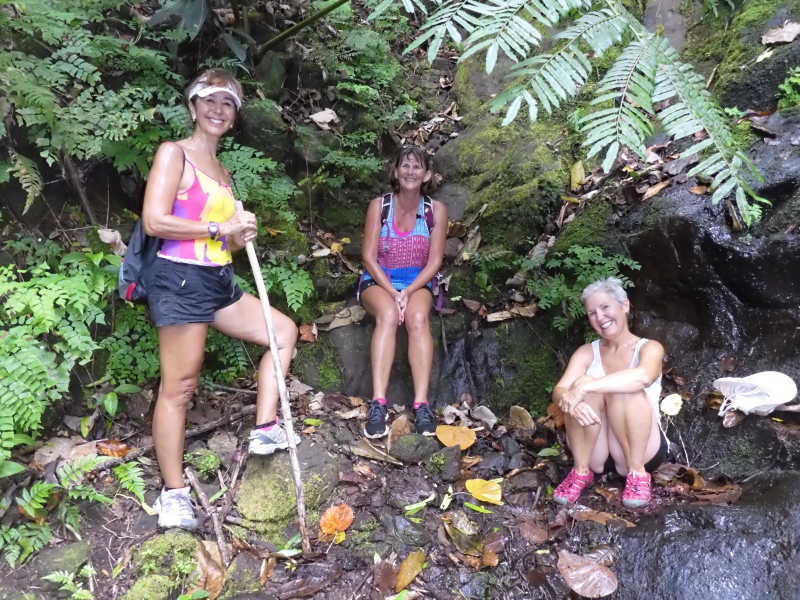 Our favourite hike was an epic, challenging, 20.3 km, ten hour hike from the ferry port at Vaiare, over on the east of Moorea, originally to Cook’s Bay, on the north of the island. An early morning bus ride to Vaiare with Jaye and Irwin from Winsome, got us on the trail by 7am and after a 90 minute steep, muddy climb we reached the Col Vaiare, (275 metres) with views of Tahiti in the distance to the south and the two bays plus farmland and mountains towards the north. We ventured off to the left and ended up on a slippery, treacherous, tree root impregnated trail with every step carefully placed. This adrenaline soaked, mosquito infested, exciting trail led us inland with amazing views of the internal monster peaks. Crossing various streams and hearing roosters and music floating up to us from the depths we knew that we were not far fromcivilisation…..but our trail which should have been going down, was ascending.