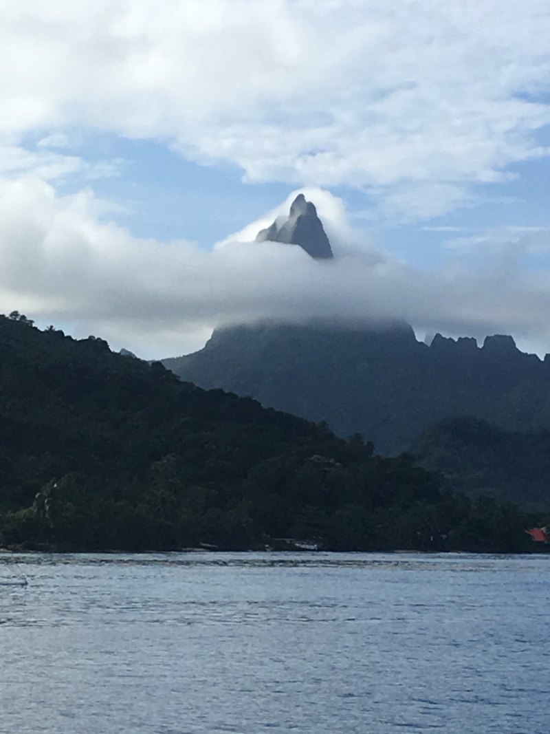 The next part of our journey was a short one, a few hours to Moorea. We were fortunate to have a favourable wind and we hoisted our new sails and blasted across the body of water. Moorea is an island of sharp peaks, deep valleys, emerald/turquoise waters and is the “getaway island” for the Tahitians. Their idyllic rustic retreat, leaving the hub bub of chaotic life behind in Papeete.