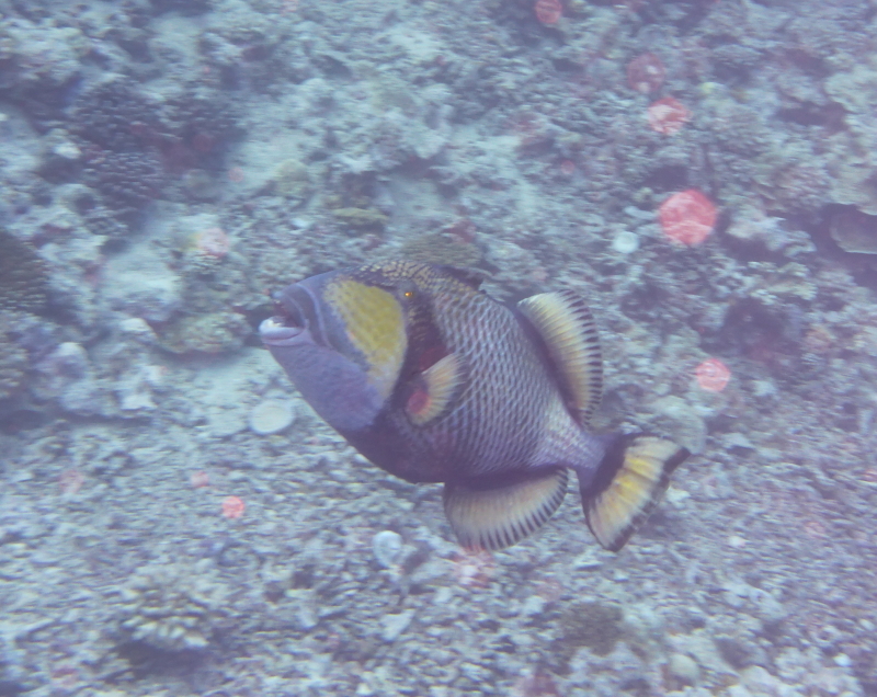 We shook out our dive gear, initially to clean the bottom of the boat which took us four gruelling attempts, then we decided that we deserved some recreational diving. The clarity of the water, huge populations of different fish and corals were staggering. During several of our dives we were charged by a vicious Titan Triggerfish, attempting to chase us away from what we presumed was her sand nest of eggs. This huge fish with it’s huge teeth had us moving off her patch quickly but not before Stephen got her photograph. On another dive we abandoned the dive after 29 minutes as a 3 metre Lemon Shark swam close to us making us realise that we were in its environment and certainly not at the top of the food chain during that short spell. Lemon Sharks are generally solitary creatures and are considered dangerous. We later learned that this shark and others were local to the area and were not interested in divers, we believe that the size of it and its disinterest in humans is due to being fed by means of “chumsicle”, a fish parcel to attract sharks for a tourist attraction!