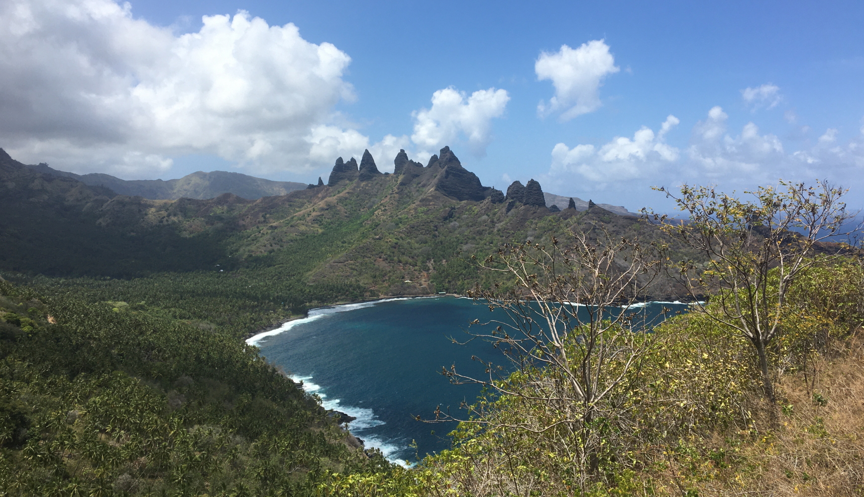 An early Sunday hike found us walking the Tehaatiki trail which followed the eastern side of Taiohae Bay, ascending a steep zigzag trail until we reached the viewpoint overlooking the east sentinel, Matauapuna and Teanapakiu bays and towards the west sentinel, Motu Nui. Looking back towards Amelie, the caldera of the volcano Taiohoa is very noticeable. The beach of Haetapatu is a steep path off the trail but we had done enough in the heat and it was time for that ice cold aperitif in the cockpit. This hike was repeated throughout our forced stay in the bay.