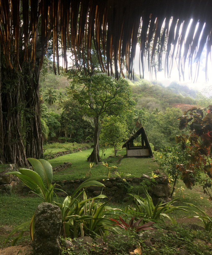The hike which was almost not a hike due to its confusing cruiser description was a delight and not to be missed. Many of our American neighbours suggested this hike to the “tikis” as a fat buster but worth the exertion. We followed their instructions to pass Larsons shop, ascend and follow the retaining wall by the recycling centre on the right and at the tree with many roots take a left up a small steep path. We met a policeman in his 4X4 and asked if we were on the right track. He looked at us with bewilderment and suggested that the Tikis were in the next valley, Taipivai. After some time he stated that further up was a marae (arena for festivities, dancing, celebrations and games) and with a smile he wished us farewell. We eventually came to a clearing with a trail and there we discovered an overgrown but spectacular vision. Tikis were nestling in the vegetation, thatched roofs on the various dwellings surrounded a marked area that suggested an arena. We walked amongst these historically significant delights, discovering many more tikis and a roughly hued pirogue protected in its own dwelling. The only noise came from the various birds in the trees and the imagination went wild. You could convince yourself of the roars of the crowds as the warriors displayed their combat skills, the beating of ancient sharkskin drums, with the masculine tones of the Hakka and the melodic high pitched singing of the women, melded with the aroma of the pig being slowly cooked over an open fire. One minute you were in the early 1700s and then the next, back in 2020. Atmospherically the area was humming with history and culture, a magnificent experience.