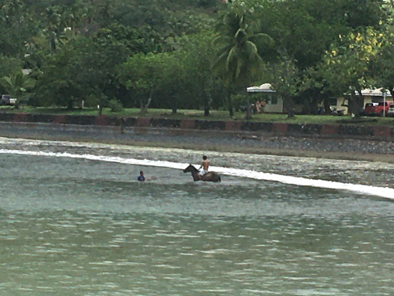 Mate drove us to one of the long fingered inlets in Baie du Controleur, Hooumi, following a tranquil estuary until we reached a sandy beach. Ponies were grazing on the grass and a few yachts were bobbing on the flat water of the bay. Allegedly there is a Manta Ray cleaning station here and the previous day, snorkelers had witnessed twelve Mantas dancing in the shallows.