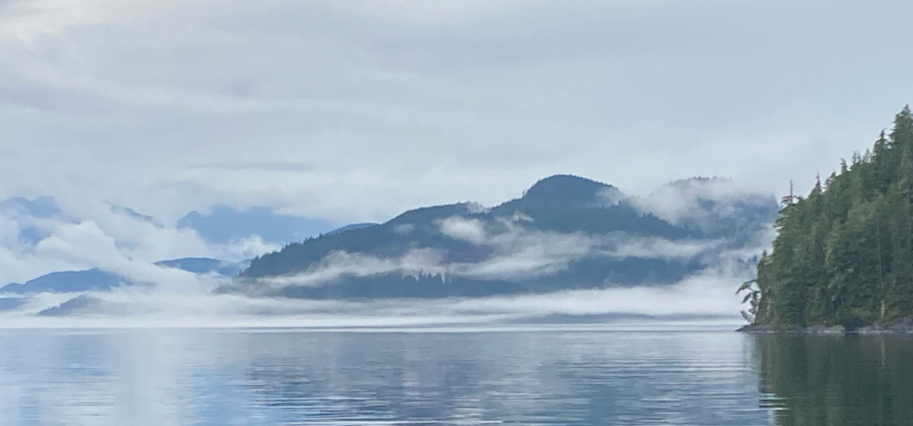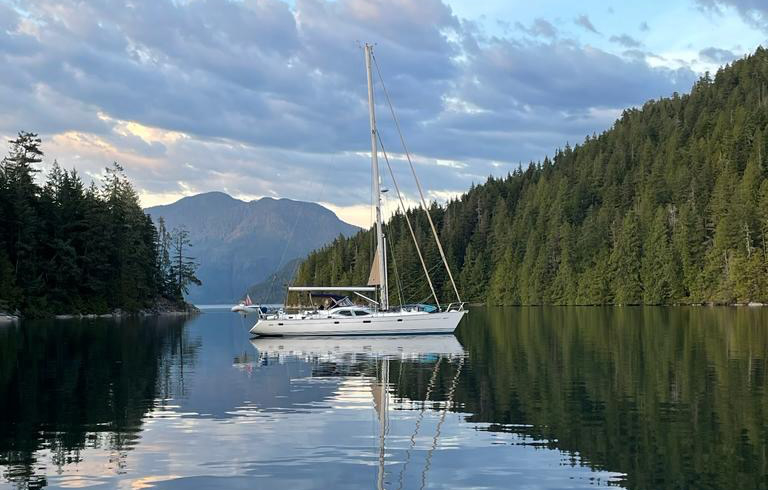 We had a short but lovely sail with the Pacific Ocean on the west and craggy rocks and islets on the east of us. Entering some of these protective anchorages takes 100% concentration but your senses are drenched in the beauty of the area. Meandering around rocks, motoring through narrow, shallow passages brought us into the large Millbrook Cove, once again not another vessel in sight. One low front after another low front kept us anchored in the bay for six days but this waiting game was enhanced by S/V Felix stealthily motoring in with Ann, John and Hercules the Yorkiepoo on board. They had experienced the vile force of the sea before aborting and needing sanctuary our bay. We quickly became the caretakers of the cove and spent many an evening with one another. They kindly allowed us to use their starlink to download weather and keep in contact with the outside world. They were fun company and we were delighted when they decided to follow us to Port Hardy. Primarily we had come to Port Hardy to provision for the next week or so but for the first time we tried out a local bar “Sporty Bar and Grill” and their fish tacos were some of the best Debbie has ever had, crammed packed full of freshly caught halibut, with a fiery pineapple salsa…..delicious.