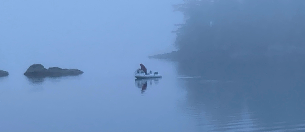 Stephen explained that we had anchored in this spot in 2016 but when we arrived, Debbie didn’t recognise it despite being exquisitely beautiful. Kelp suggested that the ground was rocky and shallow in areas. The shoreline was picture postcard, lined with trees and at their base, huge boulders. At low tide, tiny islets were attached to the land by fallen tree bridges. One rocky mound  was topped with an azure painted cabin with a picture window. Fishing paraphernalia dusted the foreshore with a partially sunken fishing boat at the base of the cabin’s foundation. Dereliction and abandonment added to the romantic aura of this magical cove. Early evening a ghostly mist wafted across the water, causing a milky appearance. This phenomenon appeared to be a reflection of what was happening beneath the surface…..an explosion of fish eggs we believe or icy stream water mixing with seawater.