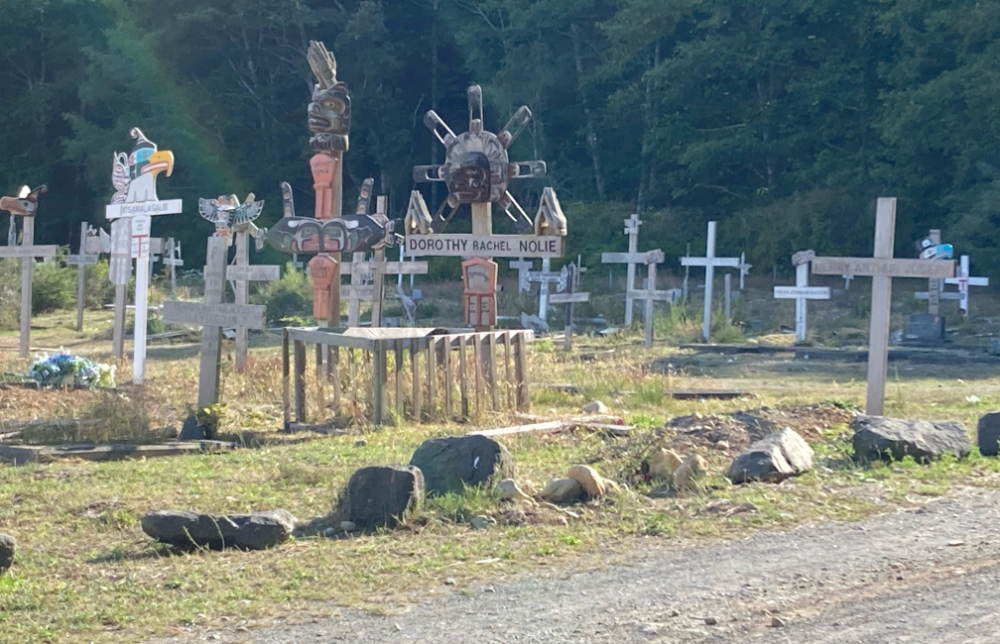 Our walk continued through a gnarled old forest, following a deer run from Leonard Point back to the Bighouse area. Here we came across a huge Indian cemetery, with crosses and traditional carvings at every grave. The community prefer for visitors to refrain from mooching around the graves as it is sacred ground.