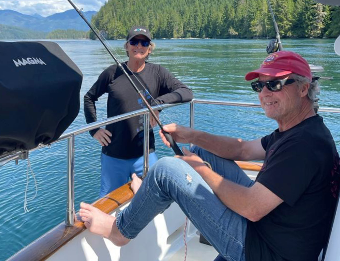 We were keen to travel distances everyday in order to meet up with our good friends, Dave and Sheila, on their new motor vessel “Far North” and what a beauty she is. There was so much excitement in seeing them again. We hung out together in idyllic anchorages, hiking, lake swimming, barbecues, crabbing, trapping prawns and salmon fishing. Sheila and Debbie have a very similar sense of humour and the laughter was non stop with the husbands’ eyebrows raising every now and again. The weather was magnificent with high temperatures, some smoky haze from the wildfires but days of never ending warmth and blue skies. Summer had definitely arrived.