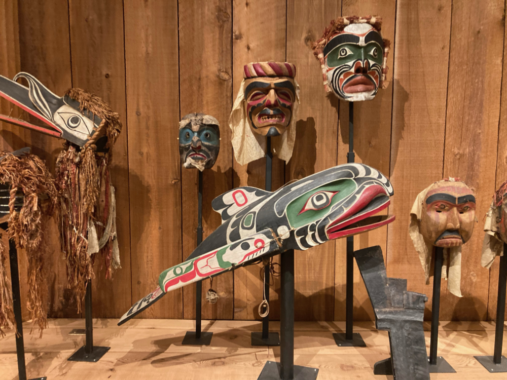 El Mundo and Amelie left sleeping Far North and continued our adventures north, catching a favourable current and minimal wind to Alert Bay, 37nm away. As we approached aband of fog hovered across the strait, making visibility tricky and naturally there were logs and kelp everywhere. After anchoring, we aided the island’s economy with a huge shopping trip and then ventured across the island to visit the tallest memorial pole and “Big House”. The building is used for Potlatches, traditional dancing and ceremonies. Outside is a huge playing field, primarily for the children but on Fathers’ Day in June, the community get together for a celebratory sports day. Alert Bay, as written about in our 2022 summer blog, is a strong First Nation community, a well organised and busy village. The people gave us a huge welcome, allowing us to dispose of rubbish free and generally passing the time of day. We witnessed this throughout the generations here. The guy at the supermarket checkout was chatty and happy, the marina manager could not do enough for us and the children in the sandpit were friendly and encouraging to Hana. While we waited for Hana to make new friends, a youngster adorned his head and arms with woven leaves. His tiny friend, with a stick, drummed on a massive log, chanting, while the older one traditionally danced around the play area. A beautiful experience, without either of them being self conscious and just doing what came naturally to them.