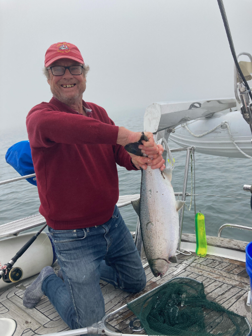 Lo and behold we caught our first salmon (Chinook) in two years using (wait for it) a pink lure that Debbie had bought. With the skipper hauling it in and Debbie hanging off the stern with the net, the other hand gripping the dinghy davit for dear life, we managed to get it on the deck. Quickly the fish was killed with Stephen’s new PINK fish whacker, bled and then filleted into eight large meal portions. The detritus was bagged and used as crab trapping fodder. Oh did we celebrate and bored our family and friends with photographs of the fish that didn’t get away!