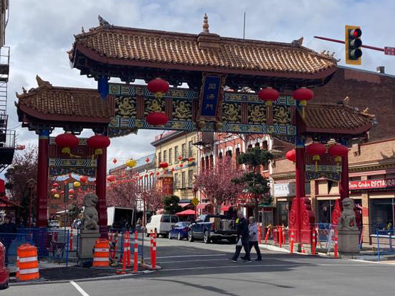 Chinatown (Forbidden City) in Victoria is the oldest Chinatown in North America. The entrance to Chinatown is via an ornate red and gold gate called “The Gate of Harmonious Interest”, guarded by granite statues of a male and female lion, weighing three tons a piece. The female lion cradles a cub and the male carries the world. These statues were gifts from Victoria’s twin city, Suzhou, in the province of Jiangsu, East China. On the top of the gate is a bottle shaped gourd embellishment, which is a charm in order to protect against evil spirits.